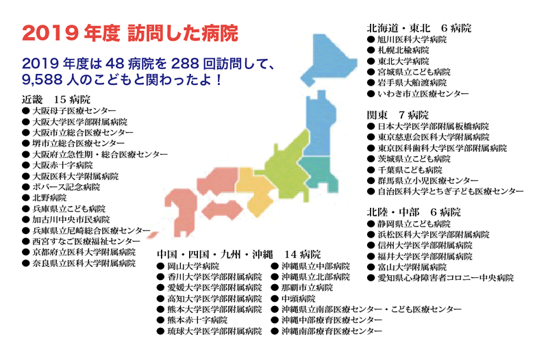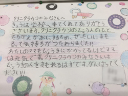 ● 先日は忙しい中来てくださって、ありがとうございました。皿回しに挑戦して楽しくって、ピンポンゲームでみんなとのコミュニケーションがとれました。コミュニケーションをとった時や、みんなで楽しく遊んだ時、心がはなやかになりました。その中でも一番楽しかったのが、拍手を回していくのが楽しかったです。1回目の時は、どっちから来るか分からなくてわくわくした気持ちが止まりませんでした。 ● 先日はお忙しい中来てくださってありがとうございました。私はぐんぐんとくまさんに、どうしてクリニクラウンになりましたか?と聞くと「人を笑顔にしたい!」「みんなを幸せにしたい!」それを聞いて、私は人にはたくさんの人を笑顔にできる力、幸せにする力を、みんなで協力して大きくすれば、たくさんの人みんなが楽しく幸せになれると思いました。 ● 先日は忙しい中来てくださってありがとうございます。入院している こどもたちを見て、クリニクラウンは元気にする力があるんだなと思いました。皿回しは難しいと思っていたけど、簡単にやってたのですごいなと思いました。ぐんぐんさんとくまさんの笑顔を見ると楽しくなりました。これからもクリニクラウンの仕事がんばってください。 |