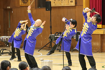 小学生プログラム(60分)★ LEDドラムパフォーマンス ★ New Era ★ 楽器紹介コーナー ★ ドラムパフォーマンスメドレー ★ コアリズム ★ 校歌 ★ 歓喜の歌 ★ アンコール |