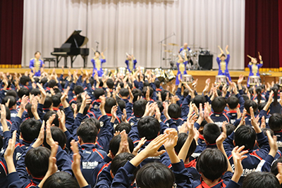小学生プログラム(60分)★ LEDドラムパフォーマンス ★ New Era ★ 楽器紹介コーナー ★ ドラムパフォーマンスメドレー ★ コアリズム ★ 校歌 ★ 歓喜の歌 ★ アンコール |